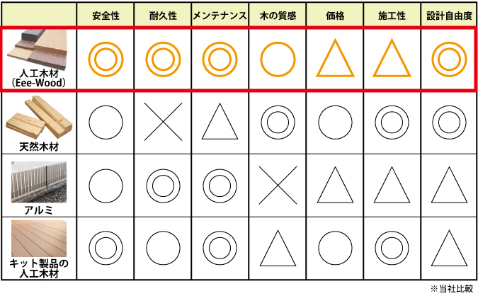 アートウッドのEee-Woodは、純木粉100%・高密度ポリエチレン・特許UVカット加工の三拍子で、SDGs対応と高品質を両立した人工木材です。